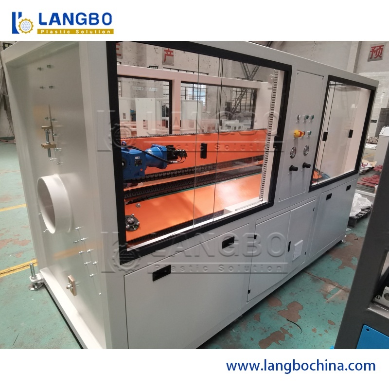 Rohmaterial + Zusatzstoff → Mischen → Materialtransport → Zwangszuführung → Konischer Doppelschneckenextruder → Extrusionswerkzeug → Durchmesserregelungseinheit → Sprüh-Vakuumformkasten → Sprüh-/Tauchkühlwasserbehälter → Markierungsmaschine → Raupenketten-Traktor → Schneider → Rohrerweiterungsmaschine → Rohrstapelmaschine → Rohrinspektion & Verpackung