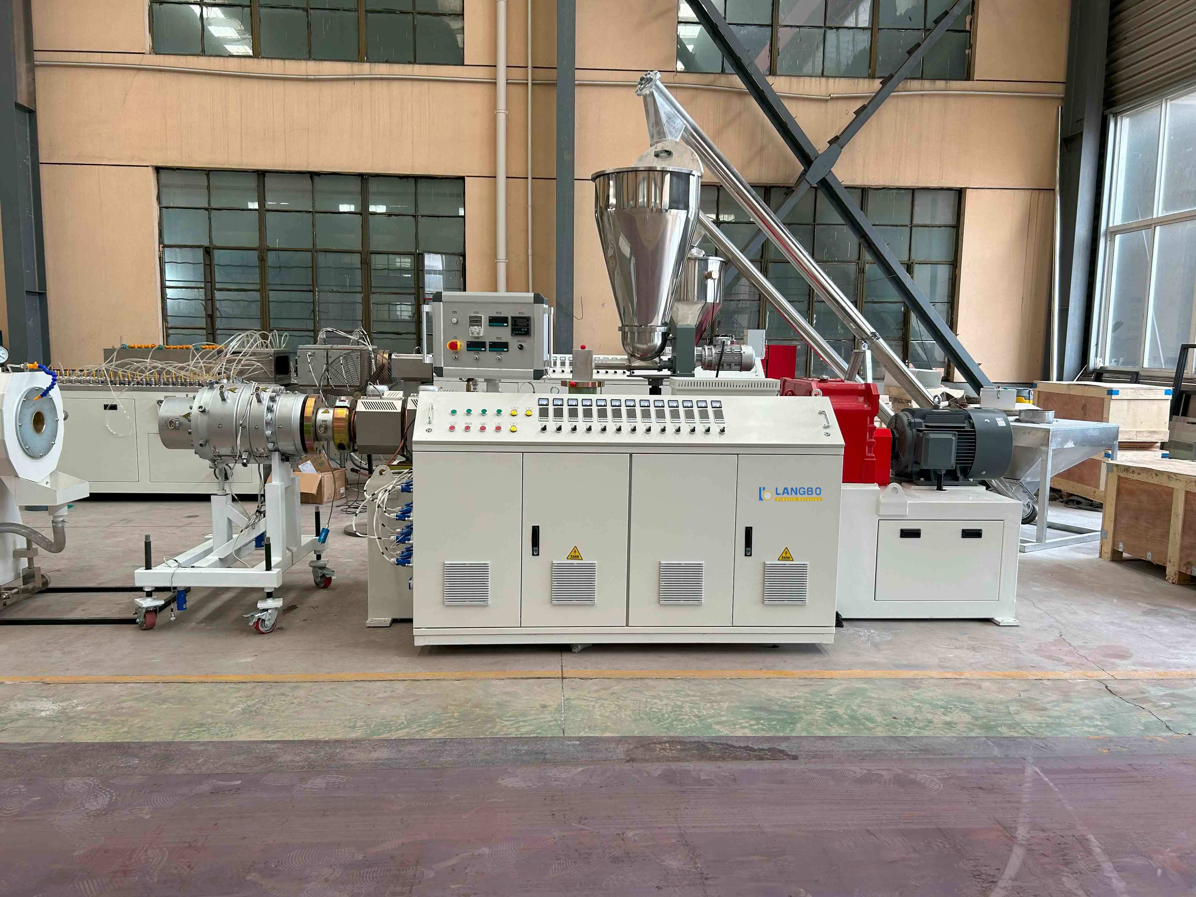 Der zweischraubende Extruder transportiert, komprimiert und schmilzt die PVC-Mischung unter kontrollierten Heizzonen.