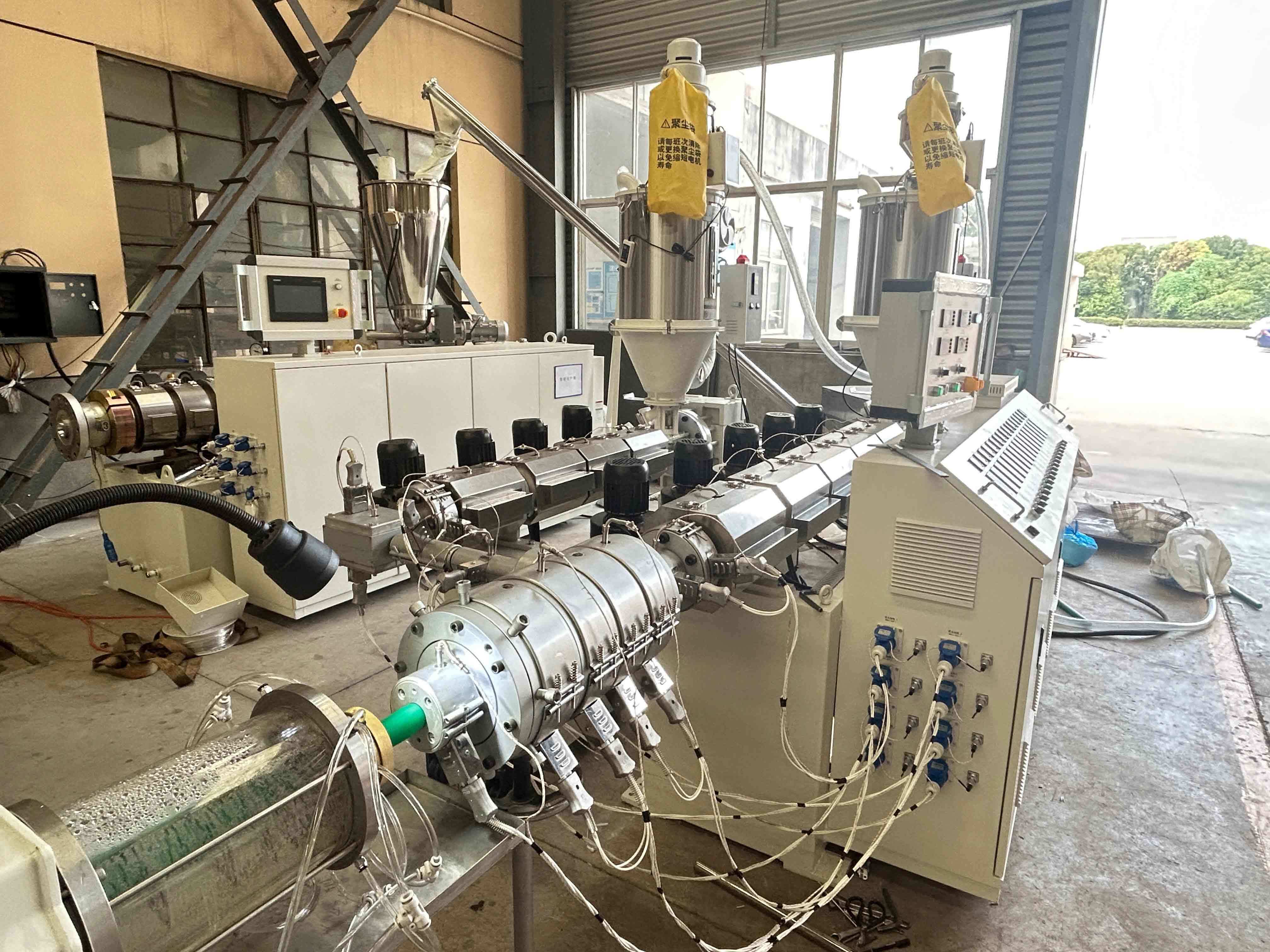 1. Die Hauptmaschine verwendet speziell für Polyolefin geeignete Schnecken. Ausgestattet mit einem automatischen Vakuumlader und einem automatischen Trockentrichter mit konstanter Temperatur bietet sie hohe Produktion, gute Plastifizierung und stabiles Extrudieren.