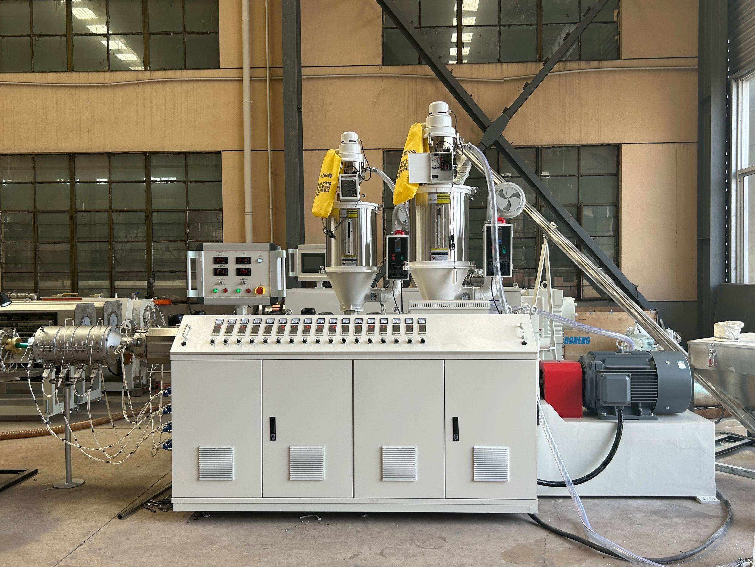 Die Rohstoffe (PPR/PVC-Pellets, Zusatzstoffe) werden automatisch in den Hopfer eingespeist und gleichmäßig gemischt.