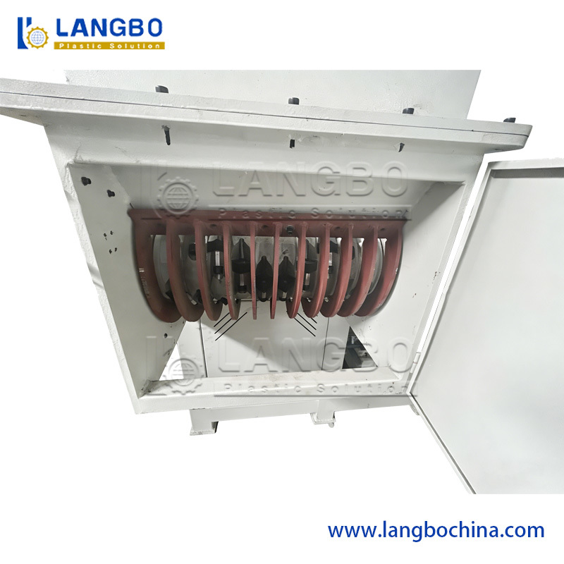 Bevor die HDPE-Rohrextrusionslinie reibungslos läuft, um Rohre zu extrudieren, müssen die Arbeiter die Maschine starten und jedes Detail während des gesamten Prozesses einstellen. In diesem Prozess entstehen viele verschwendete PE-Schmelzklumpen. Es sind große Blöcke und hart genug. Daher können sie nicht mit einem Zerkleinerer behandelt werden, sondern nur mit einem Schredder. Unser Einwellen-Schredder hat eine hohe Rotationsgeschwindigkeit und geformte Messer. Die Arbeiter geben die verschwendeten Schmelzklumpen durch die Öffnung, und die Partikel fallen aus dem Auslass.
