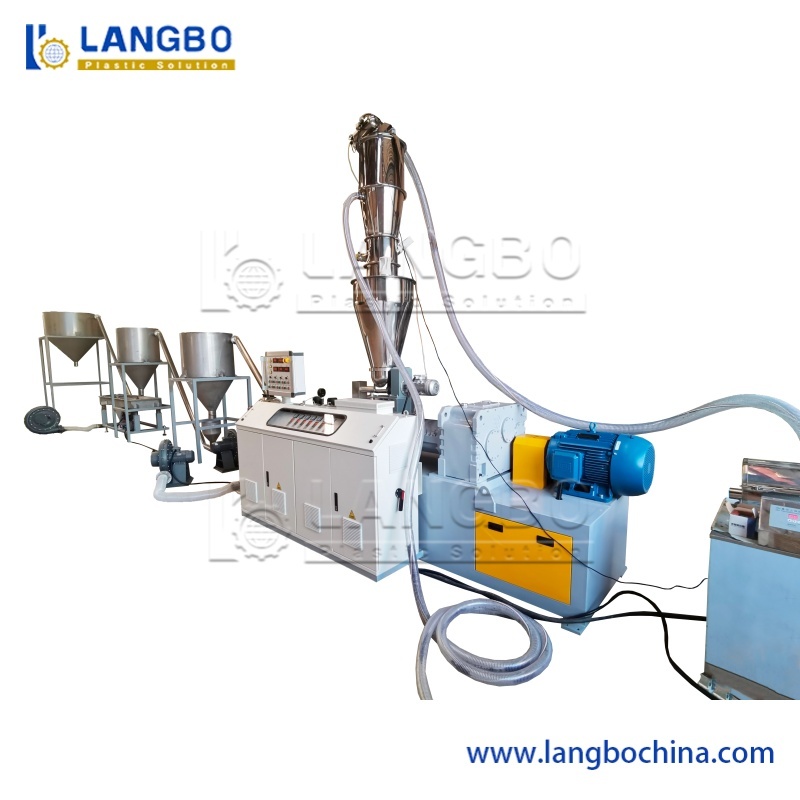 Raw material+ additive → Mixing → Conveying feeding → hopper feeding → Conical twin screw extruder → Hot face cutting → Cyclone separator → Vibration sieve → Blowing system → Storage hopper → Finished product packing